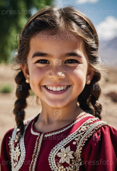 Молодая улыбающаяся девушка 5 лет таджикской национальности стоит на улице, одетая в традиционную одежду. Сгенерированный ИИ
