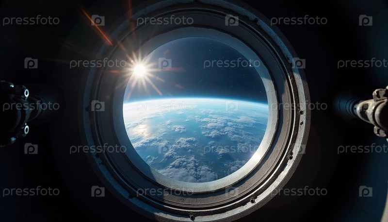 Наблюдая за планетой Земля через иллюминатор открывает захватывающий вид на заснеженные горы, безмятежные океаны и рассеянные облака, подчеркивая красоту планеты сверху. Генерирующий ИИ