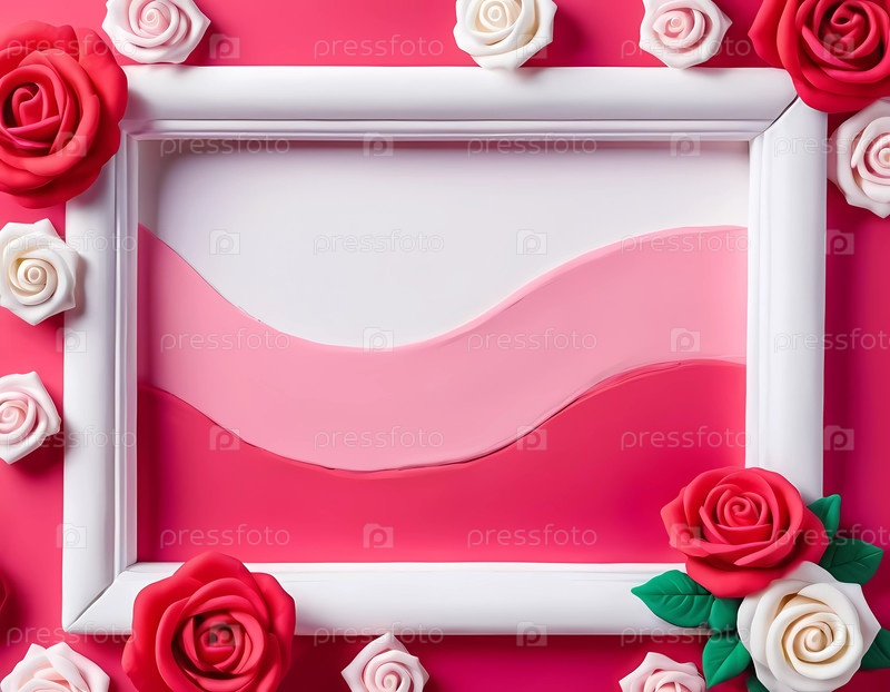 Поразительное расположение имеет белый каркас, граничащий с красными и белыми розами. Яркий розово-белый фон увеличивает пустое пространство для демонстрации произведений искусства или сообщений. Генеративный ИИ