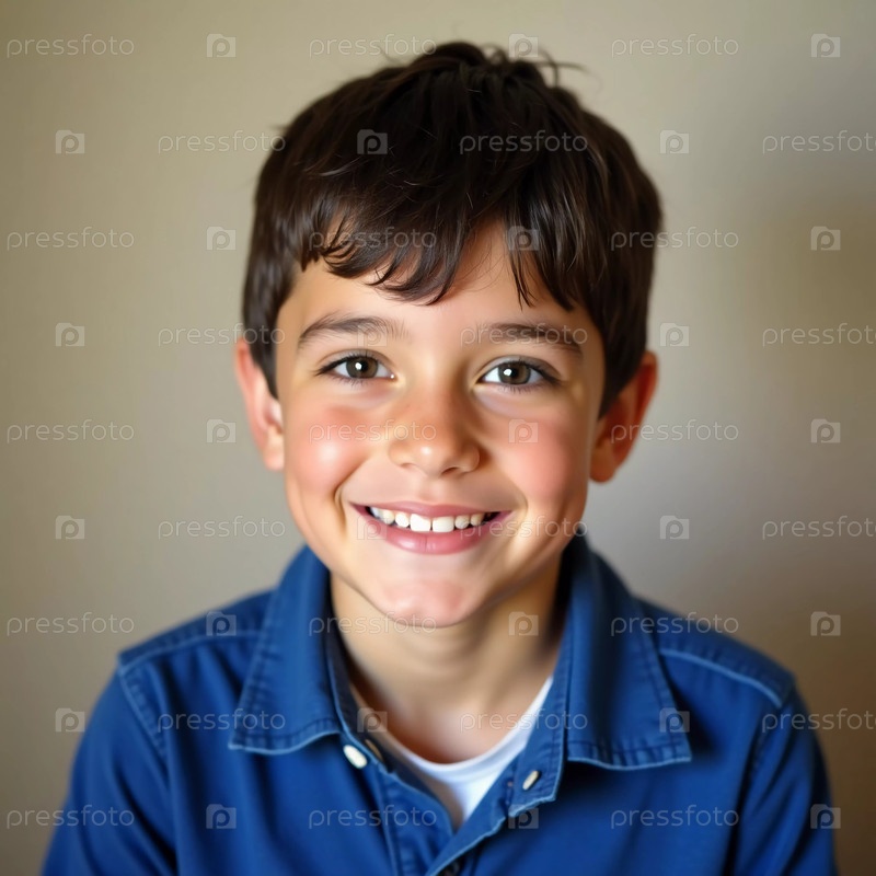 Веселый мальчик, которому около шести лет, сияет от радости в тепле своего дома. Его сверкающие глаза отражают счастье, окруженное простым, уютным фоном, который усиливает его игривый дух