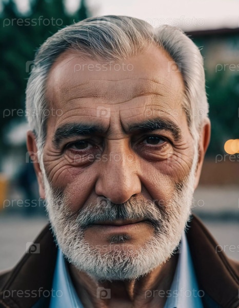 Пожилой армянин уверенно стоит с вдумчивым выражением, его серебряная борода мягко освещена золотым сиянием заката, намекая на жизнь, богатую опытом Генеративного ИИ