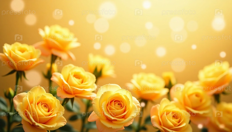 Нежные желтые розы цветут ярко, создавая захватывающее проявление тепла и красоты. На фоне мерцающего боке, который мерцает мягкими золотыми оттенками. Чувство волшебства. Чистое пространство. ИИ