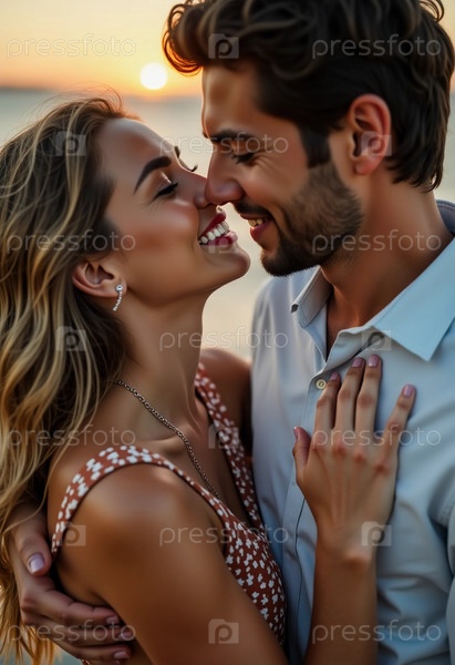 Когда солнце садится над спокойным пляжем, пара тепло обнимается, лицом к лицу, наслаждаясь моментом любви и связи, в то время как волны мягко падают рядом с генеративным ИИ