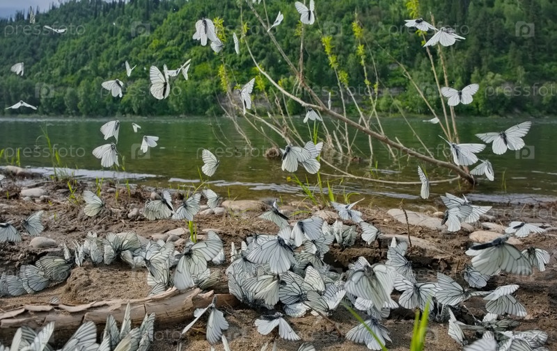 Россия, Кузнецкий Алатау. Огромное скопление бабочек капустниц на берегу реки Томь в начале знойного лета