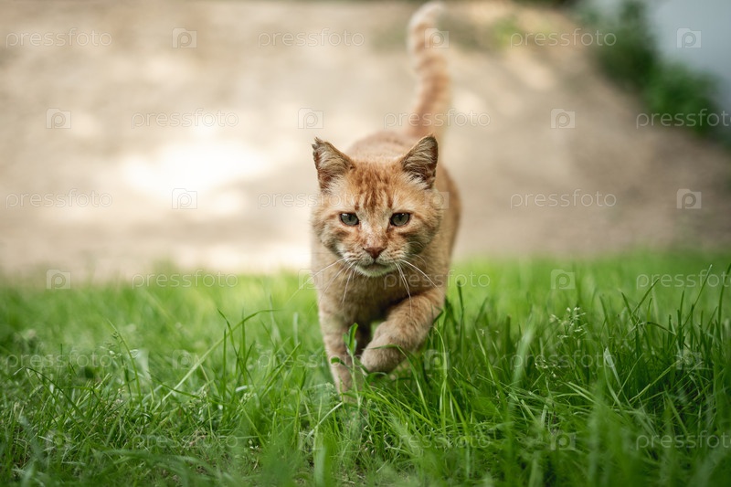 Рыжий кот идет по траве