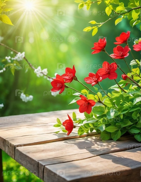 Деревянный стол сидит перед размытым фоном весеннего сада. Красные большие цветы на ветке достигают солнца, которое светит сквозь листву. Копирование пространства для демонстрации продукции. ИИ