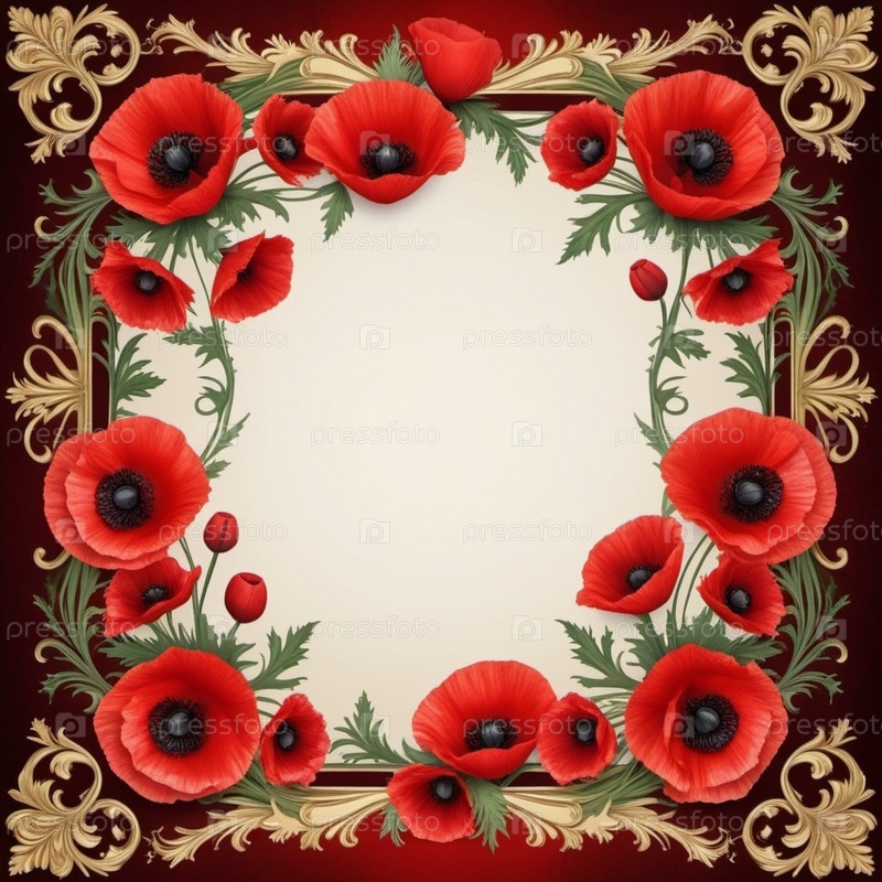 Красные маки с зелеными листьями и стеблями. Маки изображены на различных стадиях цветения, некоторые полностью открыты, а другие в зародыше. Мягкая спина, создающая деликатное и романтическое чувство