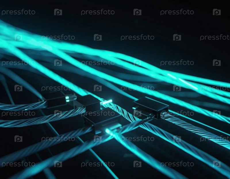 Синие и оранжевые светящиеся провода скручиваются и переплетаются на темном фоне с боке. Черные кабели и разъемы со светящимися огнями и цепями соединяются, чтобы сформировать сеть. генерируемый