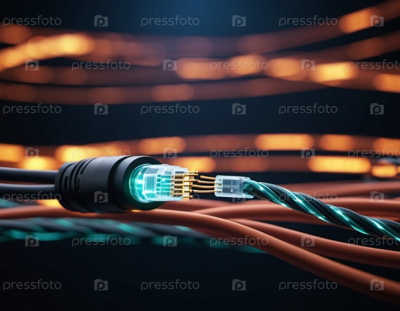 Синие и оранжевые светящиеся провода скручиваются и переплетаются на темном фоне с боке. Черные кабели и разъемы со светящимися огнями и цепями соединяются, чтобы сформировать сеть. генерируемый