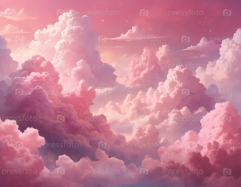 Прекрасный вид на розовые облака в ярком закате неба. Облака пушистые и полны света, создавая потрясающий визуальный дисплей. Драматические нереальные небеса с кучевыми и стратовыми облаками в атмосфере. Искусство