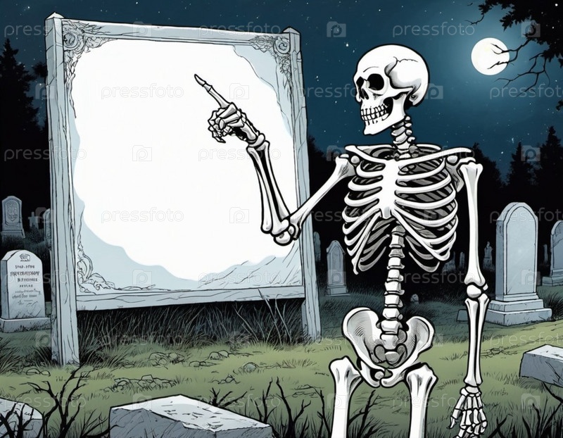 Фигура скелета стоит, держа белый плакат. Костящиеся руки скелета предлагают достаточно места для любого сообщения или дизайна. Скелет что-то предлагает. Тема Хэллоуина. ИИ