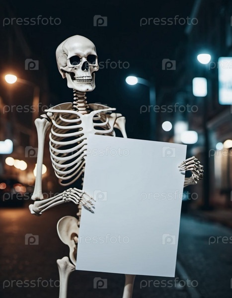 Фигура скелета стоит, держа белый плакат. Костящиеся руки скелета предлагают достаточно места для любого сообщения или дизайна. Скелет что-то предлагает. Тема Хэллоуина. генерируемый