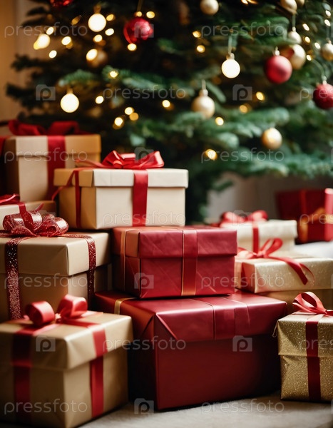 Обернутые в различные цвета подарки сидят под украшенной елкой, украшенной мерцающими рождественскими украшениями, создавая веселую и праздничную атмосферу для празднования Нового года