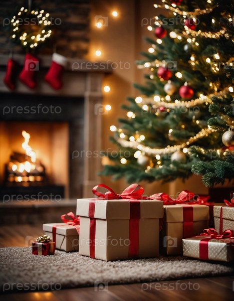 Обернутые в различные цвета подарки сидят под украшенной елкой, украшенной мерцающими рождественскими украшениями, создавая веселую и праздничную атмосферу для празднования Нового года
