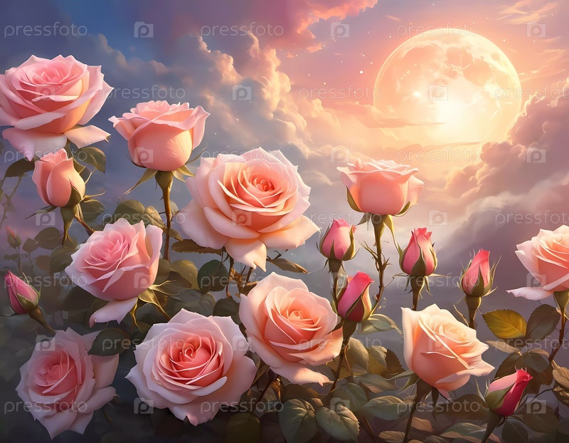 Потрясающая романтическая картина с изящными розовыми и персиковыми розами, цветущими под мягким небесным небом, с сияющим закатом, освещающим сцену. Луна и звезды, вызывающие чувство безмятежности и любви. ИИ