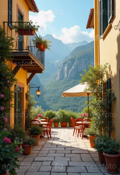Солнечная терраса, окруженная красочными цветами, приглашает на отдых, предлагая захватывающий вид и уютное место со столовыми стульями. Терраса украшена цветущими цветами и живописными горами. Генеративный ИИ