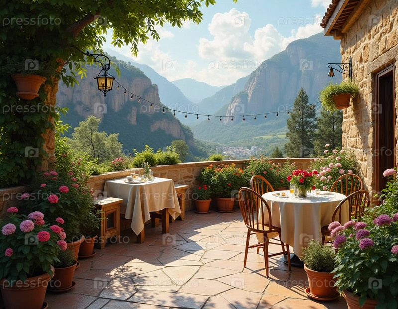Солнечная терраса, окруженная красочными цветами, приглашает на отдых, предлагая захватывающий вид и уютное место со столовыми стульями. Терраса украшена цветущими цветами и живописными горами. Генеративный ИИ