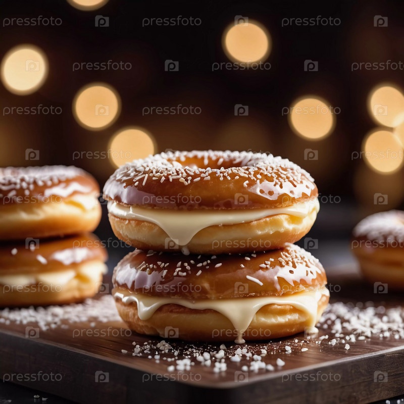 Пачка медовых глазурованных пончиков с глянцевым карамельным покрытием, украшенных хрустящими начинками, приглашая вас побаловать себя сладким угощением. Эти пончики идеально подходят для любого любителя десертов. Генерирующий ИИ