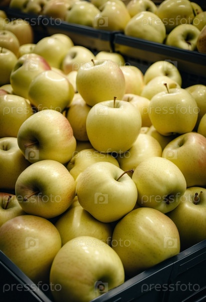 Красочный ассортимент желтых яблок аккуратно расположен на прилавке супермаркета, приглашая клиентов исследовать и выбирать свежие фрукты. Генеративный ИИ