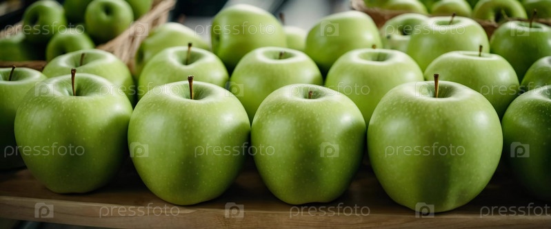 Красочный ассортимент зеленых яблок аккуратно устроен на прилавке супермаркета, приглашая клиентов исследовать и выбирать свежие фрукты. Генерирующий ИИ