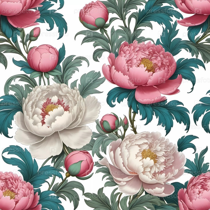Красочные пионы демонстрируют свои потрясающие цветы в оттенках розового, кремового и кораллового, окруженные пышными зелеными листьями, создавая яркий цветочный дисплей. Генеративный ИИ