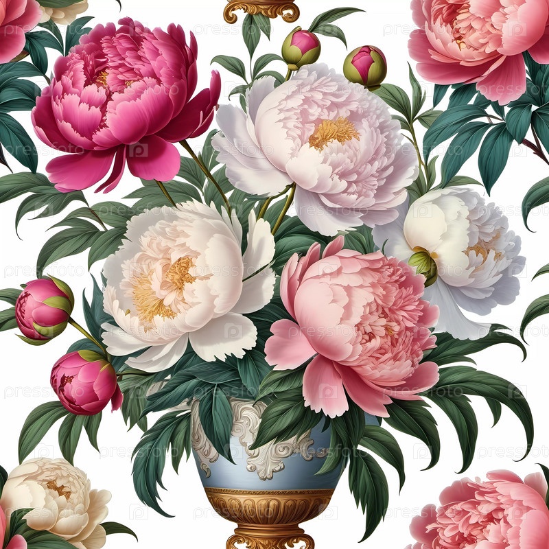 Красочные пионы демонстрируют свои потрясающие цветы в оттенках розового, кремового и кораллового, окруженные пышными зелеными листьями, создавая яркий цветочный дисплей. Генеративный ИИ
