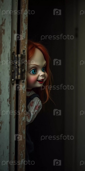 Кукла с пугающими чертами лица выглядывает из шкафа ночью, ее пронзительный взгляд и кривая улыбка создают леденящую атмосферу в тускло освещенной комнате. Страшная кукла для ужаса. Генеративный ИИ