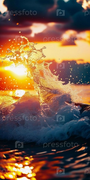 Когда солнце садится, морские волны падают на берег, создавая красивый всплеск. Небо окрашено теплыми цветами, отражающимися на поверхности океана. Морской природный ландшафт. Генерирующий ИИ