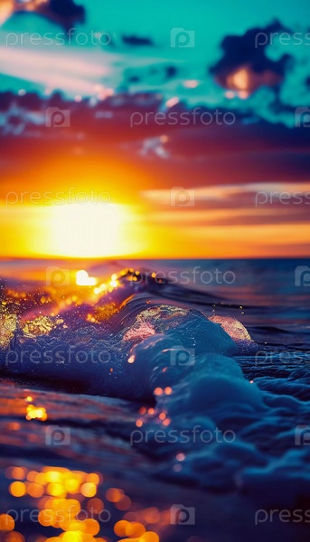Солнце поднимается над океаном, отбрасывая теплые оттенки через воду. Волны мягко катятся, создавая пузырьки, которые сверкают в раннем свете, в то время как облака пронизывают небо яркими цветами. Генеративный ИИ