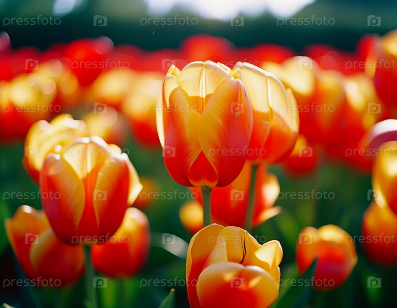 Поле тюльпанов греется в золотом солнечном свете сумерек, демонстрируя яркие оттенки оранжевого и желтого, когда цветы широко открываются. Сцена отражает суть весенней красоты. Генерирующий ИИ