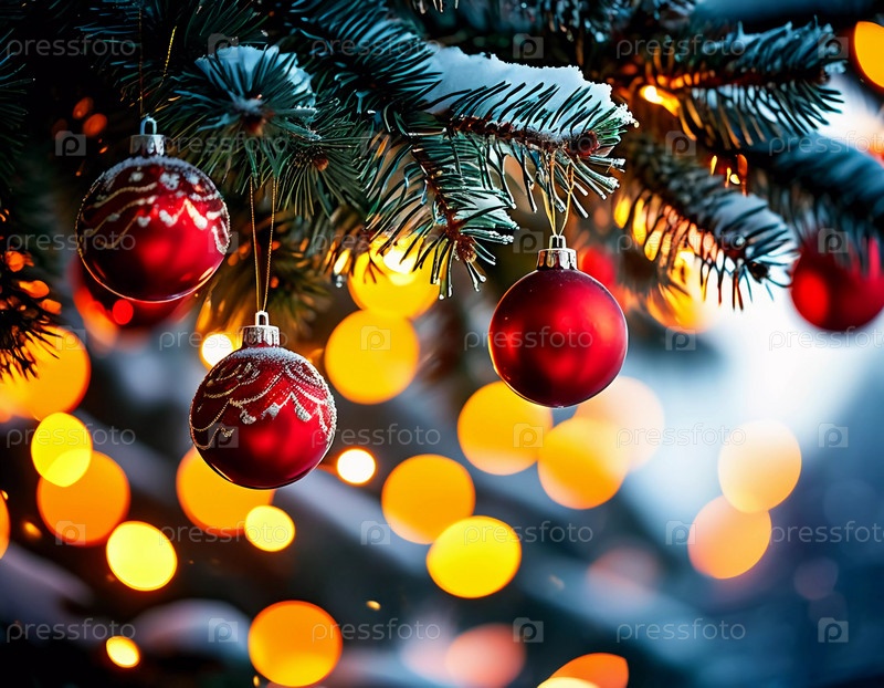 Красочные рождественские украшения украшают ветви елки, яркие шары в оттенках красного и розового, олицетворяющие праздничное настроение зимой. С Новым годом искусство боке фон. Генеративный ИИ