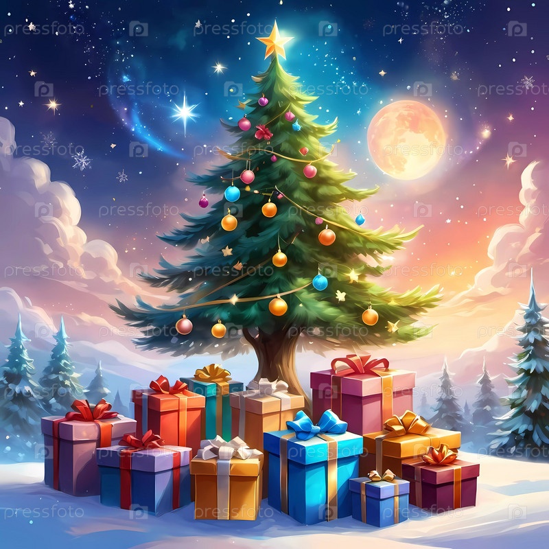 Украшенная рождественская елка, украшенная красочными украшениями и уложенными подарками, готова к празднованию в уютной праздничной обстановке. Обернутые подарки различных цветов. Праздничная атмосфера, тепло и радость. ИИ