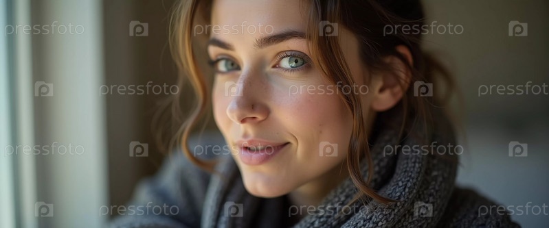 Французская кавказская красивая молодая жительница с волнистыми волосами разделяет подлинную улыбку, стоя в помещении, освещенном естественным светом, создавая притягательную атмосферу. Генерирующий ИИ