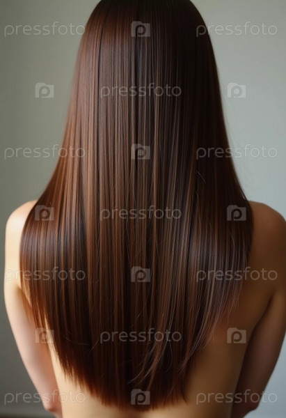 Гладкие, прямые каштановые волосы изящно текут вниз спиной, подчеркивая его здоровый блеск и однородный цвет, освещенный мягким освещением, создавая поразительный вид. Уход за волосами, эффект косметики. ИИ
