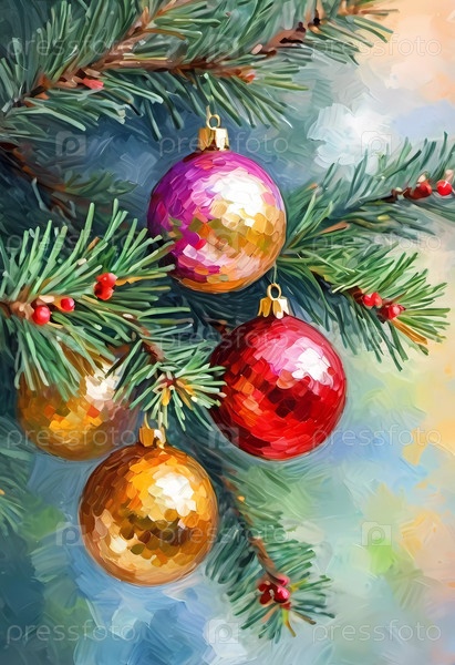 Искрометные орнаментные шары в ярком красном и золотом свисают с пышной ветки елового дерева. Мягкие, теплые огни мерцают, усиливая праздничный дух Рождества. С Новым годом. Художественный рисунок. Генерирующий ИИ