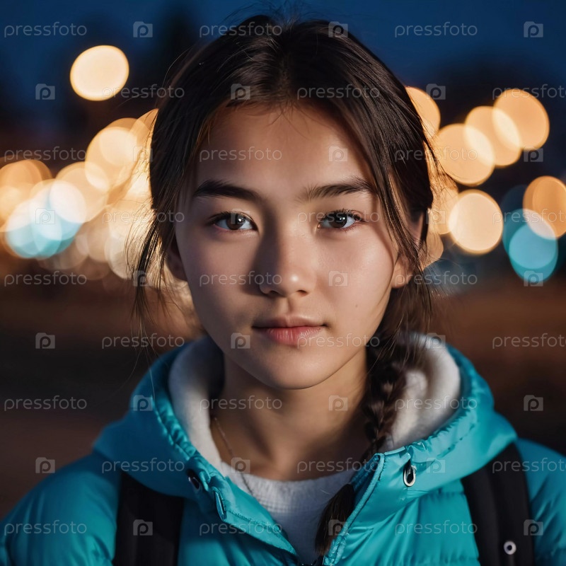 Молодая девушка с длинными темными волосами и серьезным выражением лица стоит на улице. Жительница Казахстана, красивая девушка 15 лет. Школьница, студентка или соискательница. Современное поколение. генерируемый