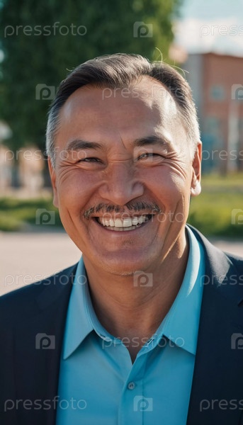 Мужчина 50 лет с искренней улыбкой стоит на улице в оживленном районе, демонстрируя дружелюбное поведение и наслаждаясь прекрасным днем среди яркой обстановки. Житель Казахстана. генерируемый