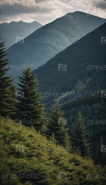 Величественные горы возвышаются над безмятежным еловым лесом под драматическим небом, демонстрируя красоту природы в сумерках. Высокие горы с холмами и угрюмым небом, освещающим мирную пустыню. ИИ