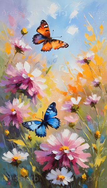 Красочные бабочки грациозно развеваются над ярким массивом полевых цветов, создавая живую и веселую атмосферу на освещенном солнцем лугу. Генеративный ИИ