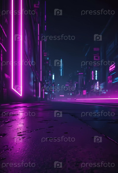 Яркие неоновые огни отражаются от мокрого тротуара в пустынной городской аллее ночью. Атмосфера ощущается электрической с намеками на тайну и глубину, усиленную гранжевыми текстурами и зерном. Генеративный ИИ