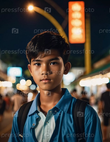 Мальчик около десяти лет стоит на шумном ночном рынке в Таиланде, освещенном красочными огнями. Он уверенно смотрит, когда люди проходят мимо, создавая оживленную атмосферу. Генерирующий ИИ