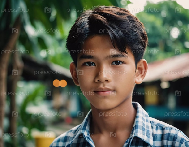 Мальчик около десяти лет, одетый в клетчатую рубашку, уверенно стоит на улице среди пышной зелени. Солнечный свет мягко освещает сцену, выделяя его черты. Генерирующий ИИ