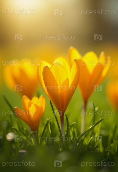 Нежный желтый цвет крокуса цветет в пышной зеленой траве, солнечный свет в спокойной весенней обстановке. Возрождение природы. Шафран Крокус является родом многолетних луковичных травных растений семейства Iris Iridaceae