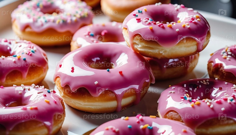 Восхитительные клубничные розовые глазурованные пончики отображаются на деревенском деревянном фоне. Посыпки и конфетные украшения добавляют яркие цвета, создавая праздничное угощение. Генерирующий ИИ