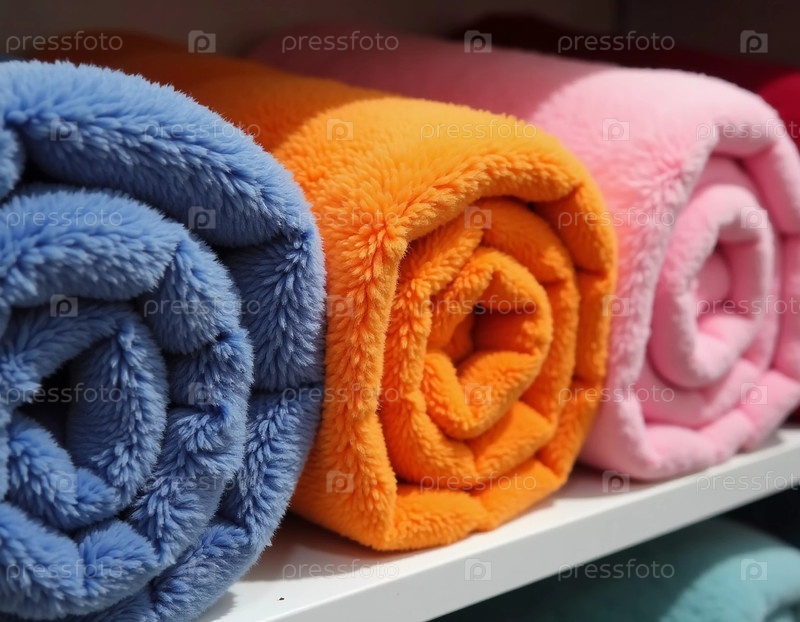 Мягкие и пушистые одеяла в ярких цветах аккуратно свернуты и расположены на полке магазина. Покупатели могут легко просматривать эту уютную коллекцию. Красный, синий, оранжевый, розовый. Генеративный ИИ
