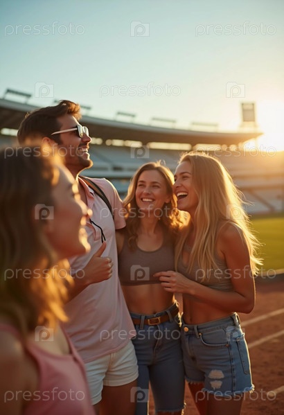 Группа друзей разделяет радостный смех, стоя рядом на спортивном стадионе на закате. Яркая атмосфера отражает их беззаботный дух, поскольку они создают прочные воспоминания вместе