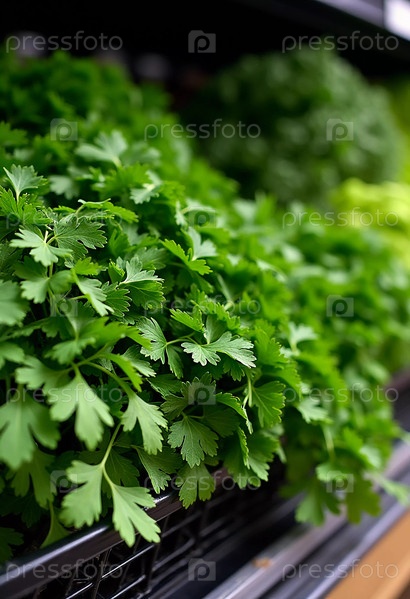 Яркая петрушка и сельдерей бросаются в глаза на стойку продуктового магазина, приглашая покупателей поднять свою кухню со свежими вкусами и питанием