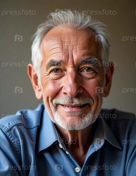 Веселый житель Израиля, ухмыляясь, удобно сидит в помещении. Его черты отражают мудрость и доброту, захватывая безмятежный момент, наполненный счастьем