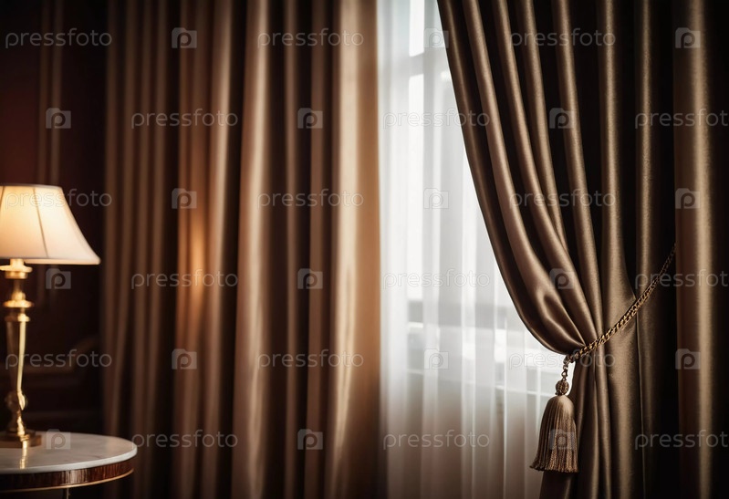 Роскошные шелковые шторы безупречно драпируются вокруг залитого солнцем окна, создавая безмятежную атмосферу в со вкусом оформленной гостиной, подчеркнутой винтажной лампой