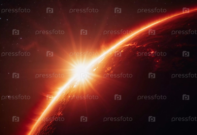 Яркий свет вырывается из горизонта далекой планеты, отбрасывая теплые оттенки через космическое полотно
